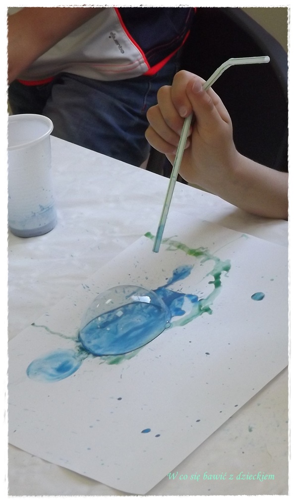 Do rozcieńczonych w wodzie farbek wkładamy jedną końcówkę słomki. Drugą końcówkę zatykamy palcem, aby trochę cieczy zostało w środku i tak przenosimy nad kartkę. Otwieramy otwór, aby farba spłynęła na kartkę. Następnie naniesioną kroplę rozdmuchujemy przez słomkę. Ciekawy efekt powstaje, gdy uda się zrobić bańkę.